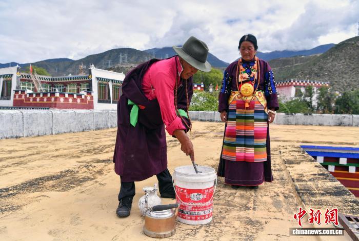 清晨,现年61岁的扎比(Zabi)穿着正式的藏族服装,一件红玫瑰衬衫使他看起来充满活力。 Zabi的妻子Murata,Wo重新组合“疯狂服装”。这是当地妇女最独特,最独特的传统服装。老人想表达他对衣服“白色礼物”的重要性。
