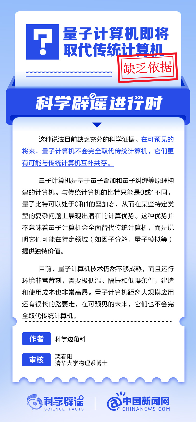 9月18日,中国新闻服务。量子计算机在大规模应用程序之前还有很长的路要走,并且在不久的将来不会完全替代传统计算机。量子计算机是基于量子重叠和量子纠缠等原理的计算机。与传统的计算机只有0或1的位置不同,量子位可以处于重叠0和1的状态,这表明某些类型的复杂问题的计算机可能受益。这个优势并不意味着量子计算机将完全替换传统计算机,而是可以在特定字段中提供独特的价值。 (资料来源:@Science谣言反驳中国新闻网络微博)